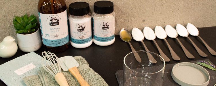 Etape 2 : Ajoutez 1 cuillère à soupe de savon noir et 35 gouttes d'huiles essentielles de votre choix